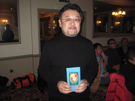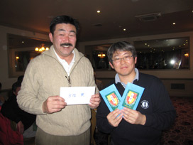 ハンディが削られない4位狙いだった手島さん。予定が狂って3位に入賞してしまいました。しかし、去年は忘年会で稼いだ4点と参加賞の12点、それにニアピン1点と、ついに8位までの入賞は一度もなし。久しぶりのお立ち台。内心は激しくスキップしておりました。