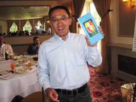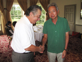 現会長の本間さん(左)は9月頭にご帰国予定だそうです。帰国後はしばらく、長野の山の中にこもって仙人を目指すそうです。新会長の鶴見さん(右)。外見に似合わず、専制君主、暴君だったら、どうしましょ。