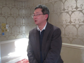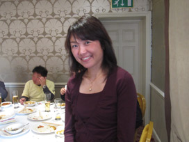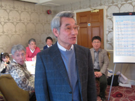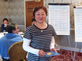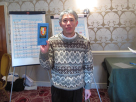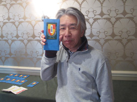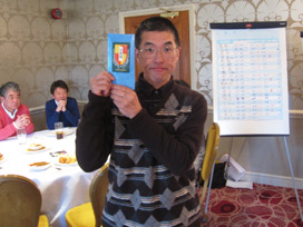 例会前夜、送別会か何かで遅くまで、もしくは朝早くまで飲んでいたという小川さん。朝礼時は二日酔いで顔面蒼白でしたが、堂々の二等賞。前夜、横に座ったオネーちゃんがアゲマンだったようです。 |