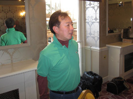 今回が最後の参加となった鈴木隆之さん。最終戦は前半39と頑張りましたが、後半はロンドンで泣かした女性の数だけ呪いがあったらしく47と大叩き。轟沈です。 |