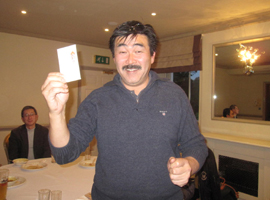 ぶっちぎりで優勝してハンディがつんと削られ、次の例会で奈落の底に落ちていく典型的なパターンとなった坂本さん。見事ブービー賞です。入会してわずか3回の例会でもう2回も幹事さん。立派です。 |