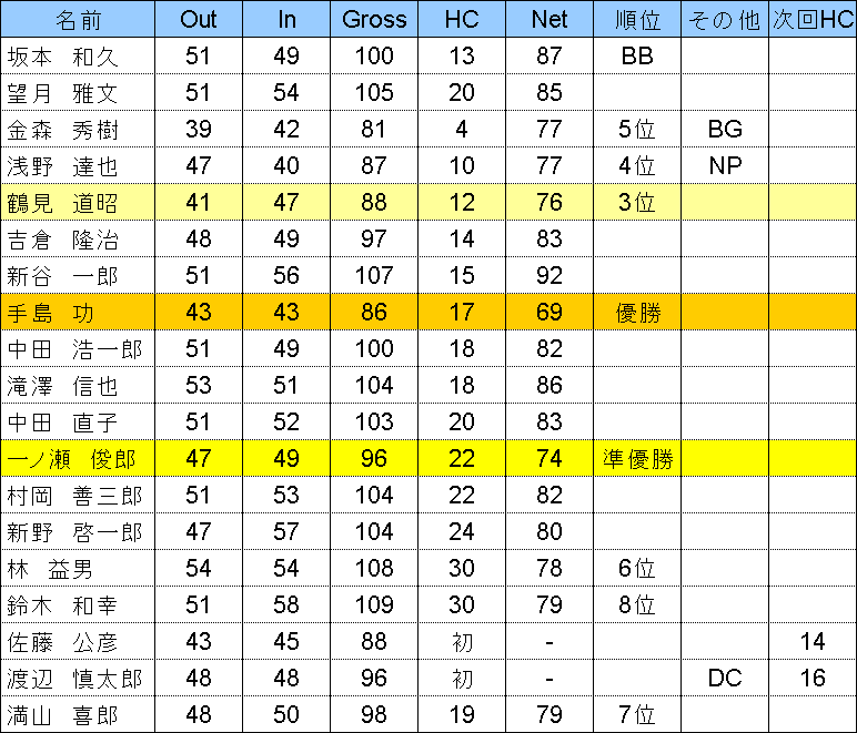 ハンディを17もいただき、毎回優勝候補と噂されて参りました私、手島ですが、最後にようやくエンジンがかかりました。まあ、最後までエンジンかからなかった人よりはいいけど…(こういうこと言うから孤立する) |