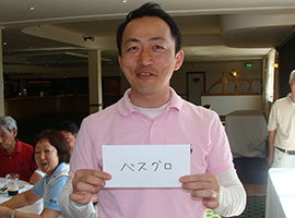 グロス86でブービー賞に輝いた浅野さん。86でプレーしながら罰として次回当日幹事です。頑張ったって報われないこともある。人生とはそんなものです。飯塚さん、お気を付けください。 |