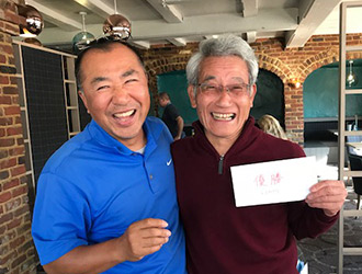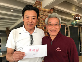 幹事さんは大変です。朝早くから準備してパットの練習すらしないでの出発。しかし肉離れも幹事の労苦も克服して見事2位に入られた及川さん、立派です。右は同じく幹事で予定通りメーカーになられたのにやたら笑顔の吉倉さんです。