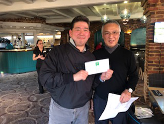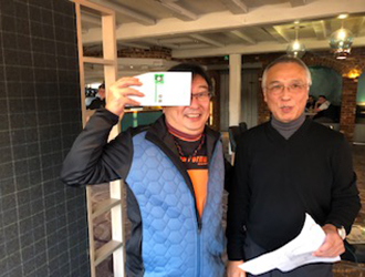 そこで2018年のピカデリー会チャンピオンに輝いた平田勝美さん(写真左)に一生遊んで暮らせると噂の賞金300ポンドが森内会長から手渡されました。